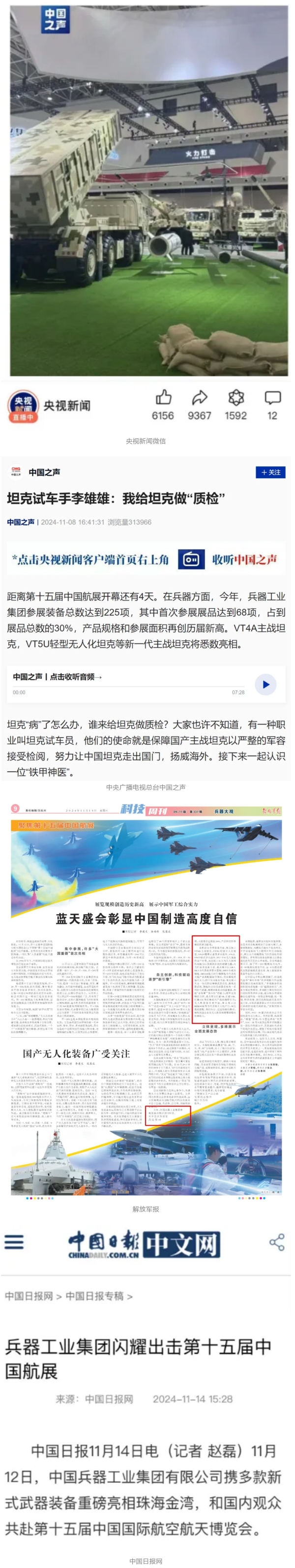 11月12日至17日,第十五屆中國國際航空航天博覽會在廣東省珠海市舉行,中國兵器工業(yè)集團有限公司突出數(shù)智賦能軍貿(mào)合成旅作戰(zhàn)體系,帶來了一系列新產(chǎn)品、新技術(shù)、新體系,全方位展示我國陸軍外貿(mào)武器裝備發(fā)展最高水平、最新突破、最前沿成果,立體化呈現(xiàn)陸域信息化、智能化、體系化作戰(zhàn)能力,受到了全社會廣泛關(guān)注。航展期間,央視綜合頻道《新聞聯(lián)播》、央視新聞頻道《新聞直播間》《長空鵬程》報道兵器工業(yè)集團參展情況,重點介紹了VT4A1主戰(zhàn)坦克、輪式裝甲火炮、新一代陸域指控信息系統(tǒng)、無人戰(zhàn)車、民用無人運輸機及地面裝備演示有關(guān)內(nèi)容。央視新聞推出航展直播節(jié)目《藍天之約》,邀請兵器工業(yè)集團嘉賓對參展情況、裝備動態(tài)演示作了講解。